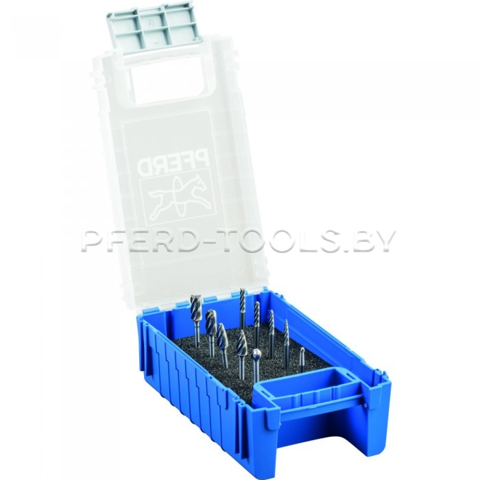 Набор твердосплавных борфрез ALU Set 1603 содержит 10 борфрез наиболее популярных форм и размеров. Защитный пластмассовый бокс предотвращает повреждение и загрязнение инструментов.